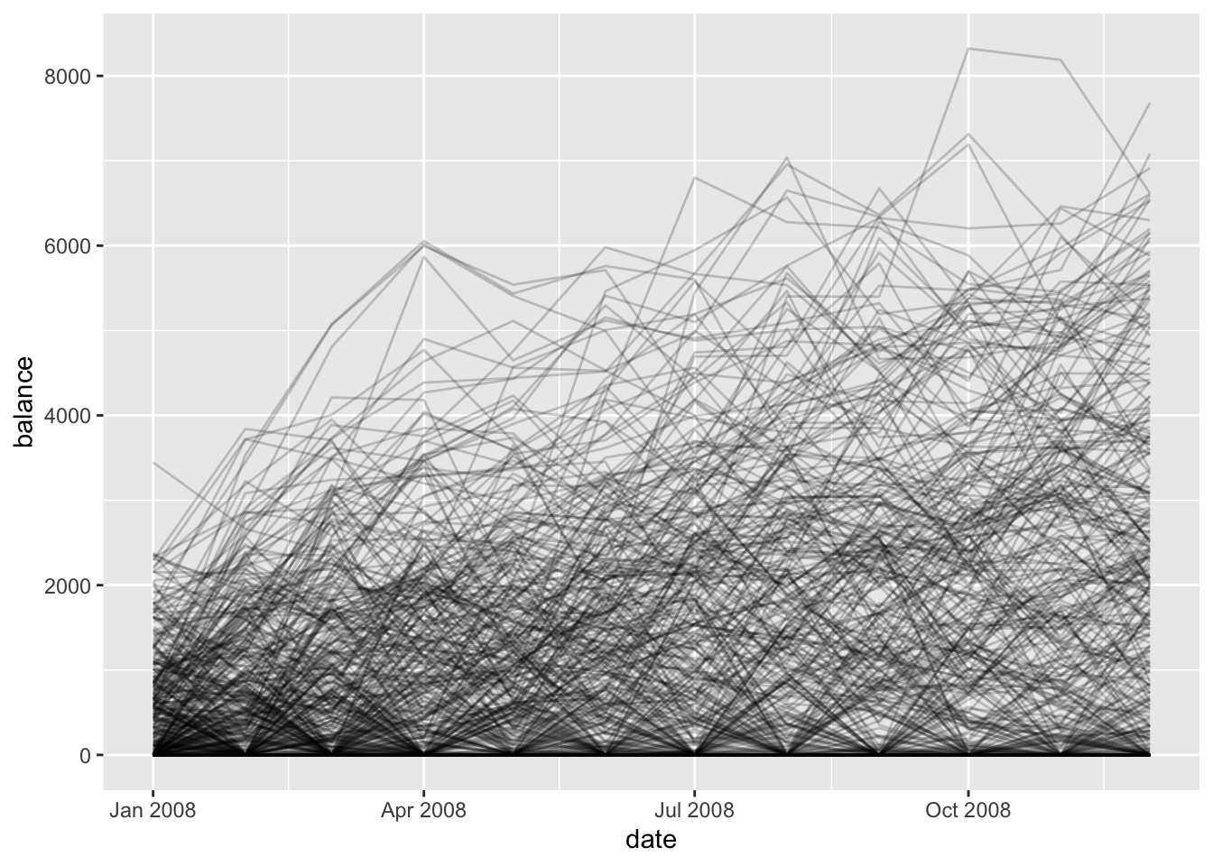 So we’ve got monthly balances for one year from 500 accounts. Let’s plot the data!