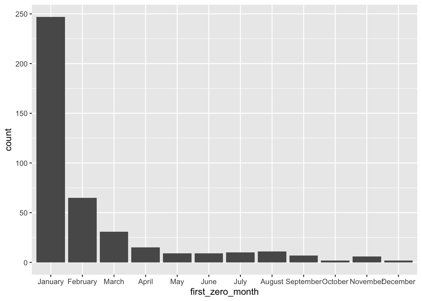 Survival analysis is all about examining time-to-event phenomena. Back in ecology land, the event was death, but when does a bank account die? Earlier we floored balances at zero. Some banks charge overdraft fees, so when a customer reaches zero, they’re likely to be charged a fee. We’ll just assume that reaching zero means that a bank account is done for. First let’s calculate the first month that the account hit zero. That’s when the “death” event occurs.