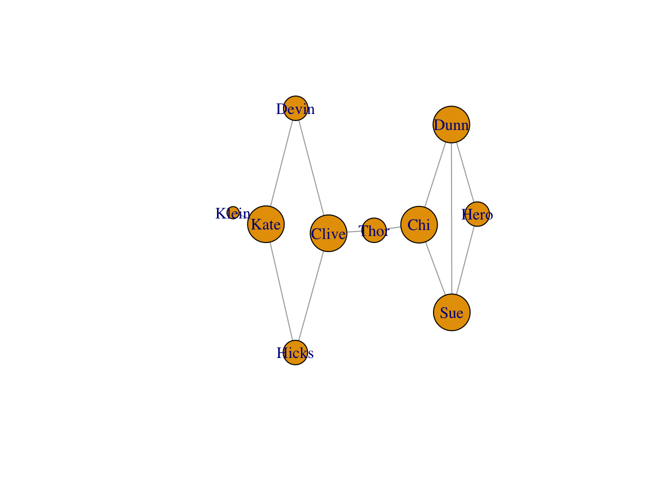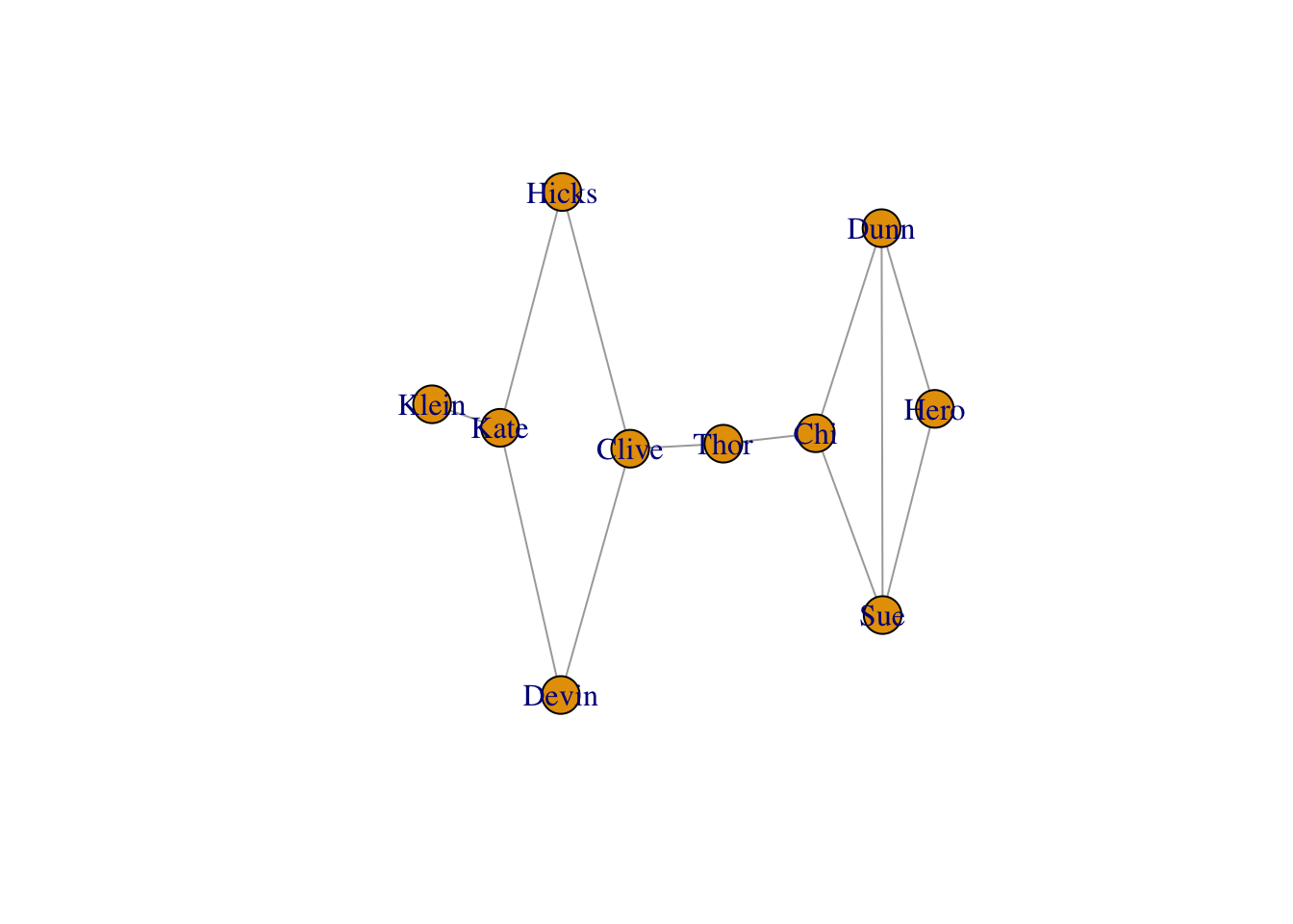 edges <- c("Hero", "Dunn", "Hero", "Sue", "Dunn", "Sue", "Dunn", "Chi", "Sue", "Chi", "Chi", "Thor", "Thor", "Clive", "Clive", "Hicks", "Clive", "Devin", "Hicks", "Kate", "Devin", "Kate", "Kate", "Klein")